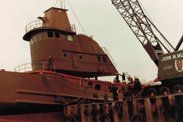 Mullins Rigging Matton Shipyard in Troy lifting house onto new tugboat. Weight: 33 Ton.