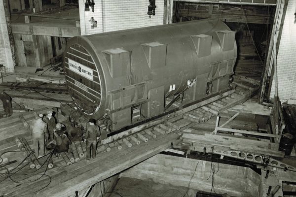 Mullins Rigging Fisk station-unit18-turbo generator-view showing stator being moved into building and set over foundation.